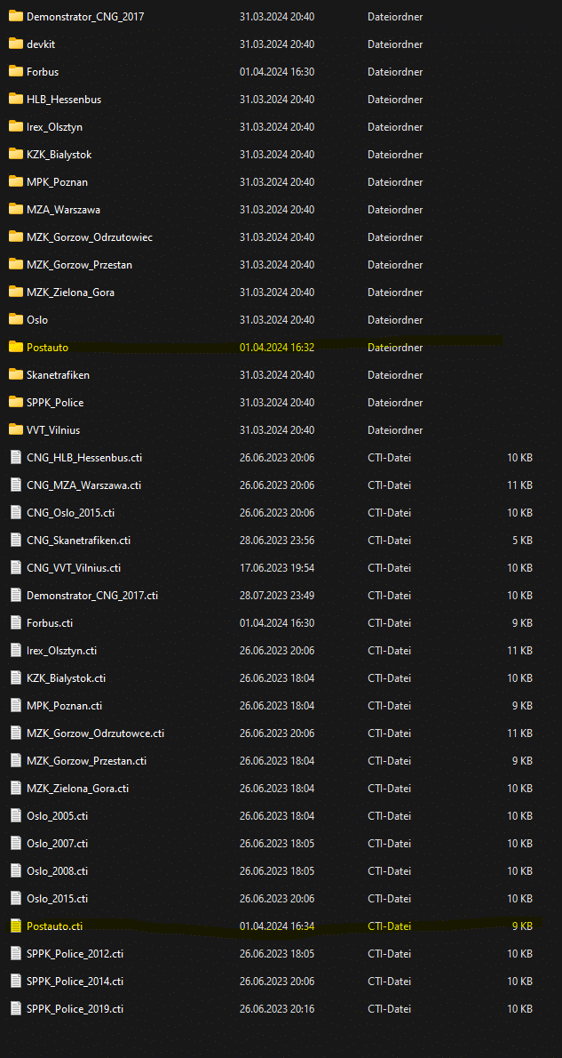 Dann habe ich hier die Übersicht der Dateinamen im Repaintordner "Postauto" und die CTI Datei: