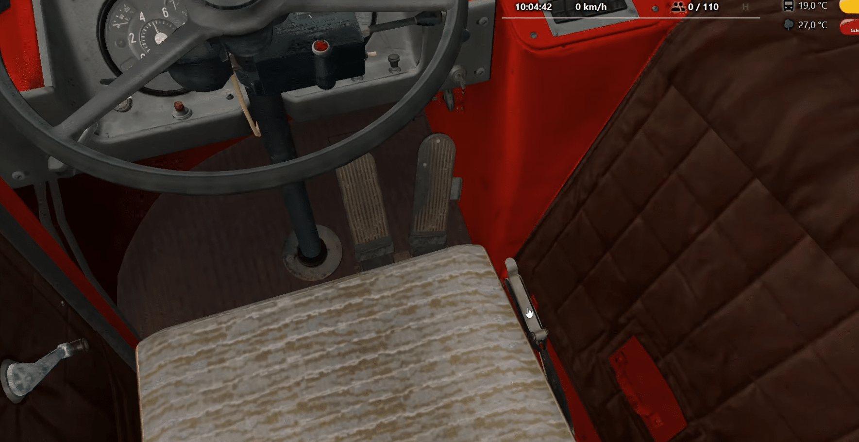 Die Handbremse dieses Busses ist mechanisch und besteht aus einem Ratschenmechanismus. Daher ist der Hebel niemals fixiert – weder in der angezogenen noch in der gelösten Position. Um die Handbremse zu lösen, müssen Sie den kleinen Hebel am großen Hebel drücken – dann gibt die Stange den Ratschenmechanismus frei und die Bremse wird entriegelt.