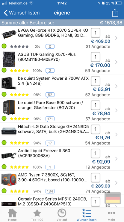 Erstmal Danke....der Gedanke von mir mit der 2070 war eigentlich, wenn die RTX 3000er rauskommt, wird meist die Vorgängerkarten günstiger.....gut RAM kann man sich darüber streiten, hatte es nur wegen der hohen MHz Werte genommen, wodurch der Ryzen stark profitieren sollte....und Danke an den Hinweis mit der SATA M.2 SSD, hatte die ganze Zeit den Fehler gesucht, warum es so günstig ist ( für eine gescheite M.2 zu günstig) ....MB keine Ahnung, dachte dass ich mit dem TUF X570 eigentlich gut aufgestellt wäre....eventuell hier eine Idee, welches MB ich nehmen soll ohne so ein überteuertes ROG Brett zu nehmen?