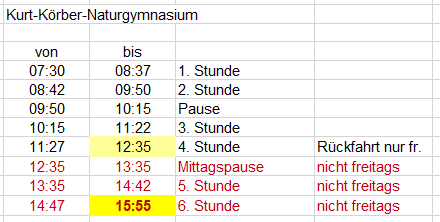 Das sind die vollständigen Unterrichtszeiten. Rückfahrten gibt es nur zu den gelb markierten Zeiten!