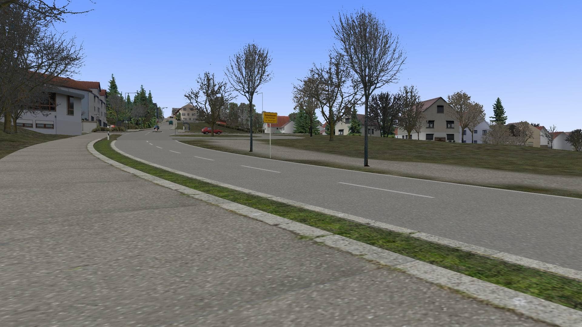 Eine große Last ist mittlerweile ebenfalls von meinen Schultern gefallen: Der Bereich "Unter den Linden" zwischen Arbeiterwohlfahrt und Hotel Germania war bisher in Form zweier Kreuzungsobjekte und dazwischen mit Splines umgesetzt. Da sich der Straßenquerschnitt, sowie die Höhe in diesem Bereich fortlaufend ändert, was mit Splines nicht gut dargestellt werden kann, sah das mehr als dürftig aus. Zudem hatte ich die dortigen Radfahrstreifen ausgespart, da ich ursprünglich vorhatte, diese später einfach per Spline "drüberzulegen". Die Fähigkeiten und Ansprüche wachsen jedoch mit der Zeit und deshalb war mir klar, da muss ich nochmal ran.
