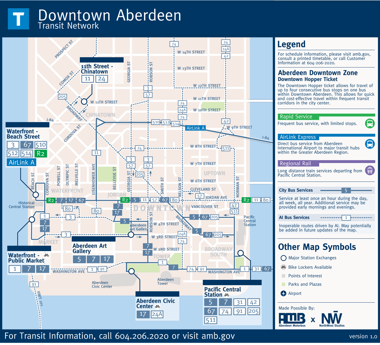 The AMB operates the majority of routes in the Greater Aberdeen Region, including the main tourist Route 17 Aberdeen Civic Center / Waterfront Public Market. Further, the AMB also operates an assortment of local and express services, including the 67 and 67X to the International Airport. Within the Aberdeen Downtown Area (Zone A), fares are heavily subsidized by the municipal government, so residents are encouraged to take advantage of the routes offered by the AMB.