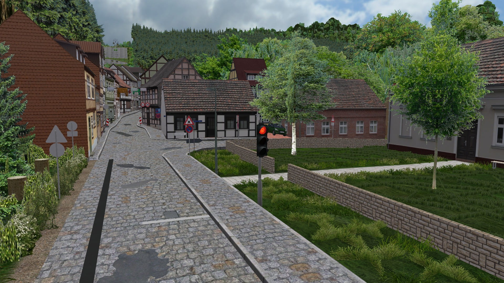 Dieser Abschnitt ist bekannt, aber jetzt geht es um die Straße, die hier nach rechts geht. Außerdem ist aufgrund der Engstelle in Kombination mit der engen Kreuzung eine Ampelanlage entstanden, die den Verkehr regelt.