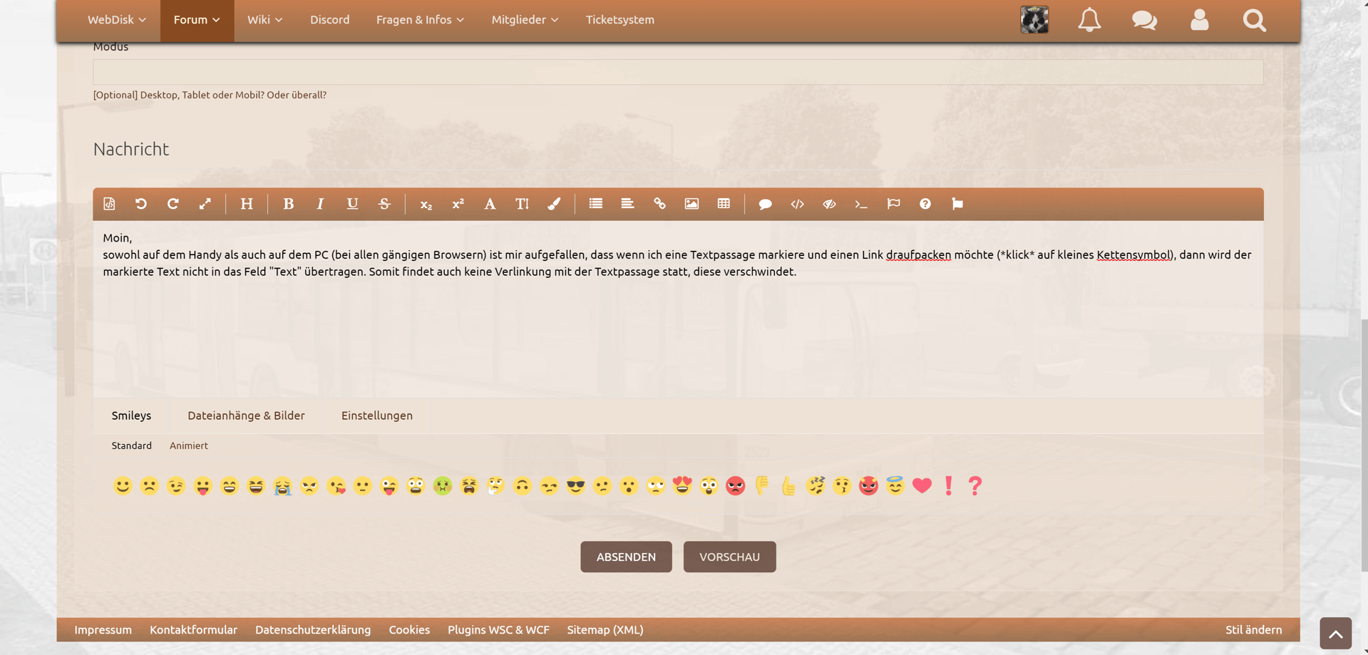 sowohl auf dem Handy als auch auf dem PC (bei allen gängigen Browsern) ist mir aufgefallen, dass wenn ich eine Textpassage markiere und einen Link draufpacken möchte (*klick* auf kleines Kettensymbol), dann wird der markierte Text nicht in das Feld "Text" übertragen. Somit findet auch keine Verlinkung mit der Textpassage statt, diese verschwindet.
