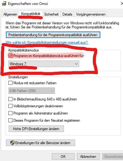 Falls du nicht weißt, wie das geht: Rechtsklick auf die OMSI.exe -> Eigenschaften -> Reiter "Kompatibilität" -> Haken setzen bei "Programm im Kompatibilitätsmodus ausführen für:" -> Windows 7 in der Liste auswählen.