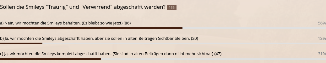 c) Ja, wir möchten die Smileys komplett abgeschafft haben. (Sie sind in alten Beiträgen dann nicht mehr sichtbar) (44) 30%