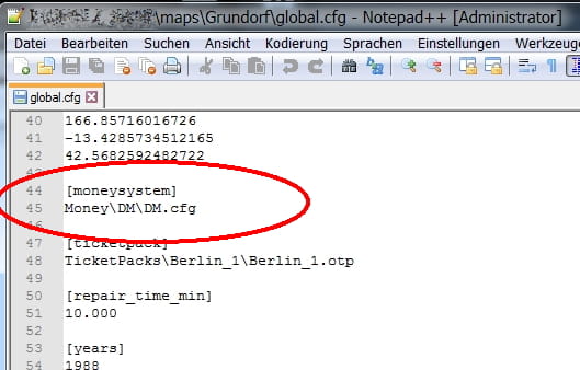 als erstes öffnest du die global.cfg-Datei der Map. Dort siehst du etwas weiter unten die Rubrik "[ticketpack]". Jetzt gehst du in deinen OMSI-Ordner und suchst dir im "TicketPacks"-Ordner irgendeine Map aus, die die Währung Euro hat. Den in der -.cfg von Spandau/Grundorf stehenden Pfad musst du dann zu dem Pfad der Map ändern, die Euros hat. Am Ende muss eine .otp-Datei stehen.