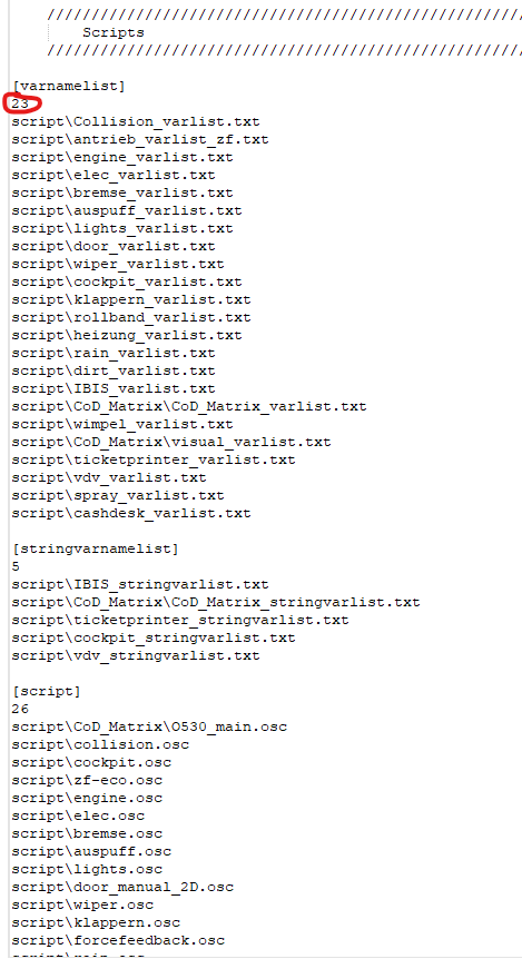 Als Erstes musst du die .bus-Datei des Busses öffnen und zu den Scripts runterscrollen. Je nachdem, wo du die Scripts eingefügt hast, musst du die rotmarkierte Zahl um 1 höher setzen. Falls du 2 oder 3 Sachen hinzugefügt hast, dann um 2 oder 3 höher setzen. ![]()