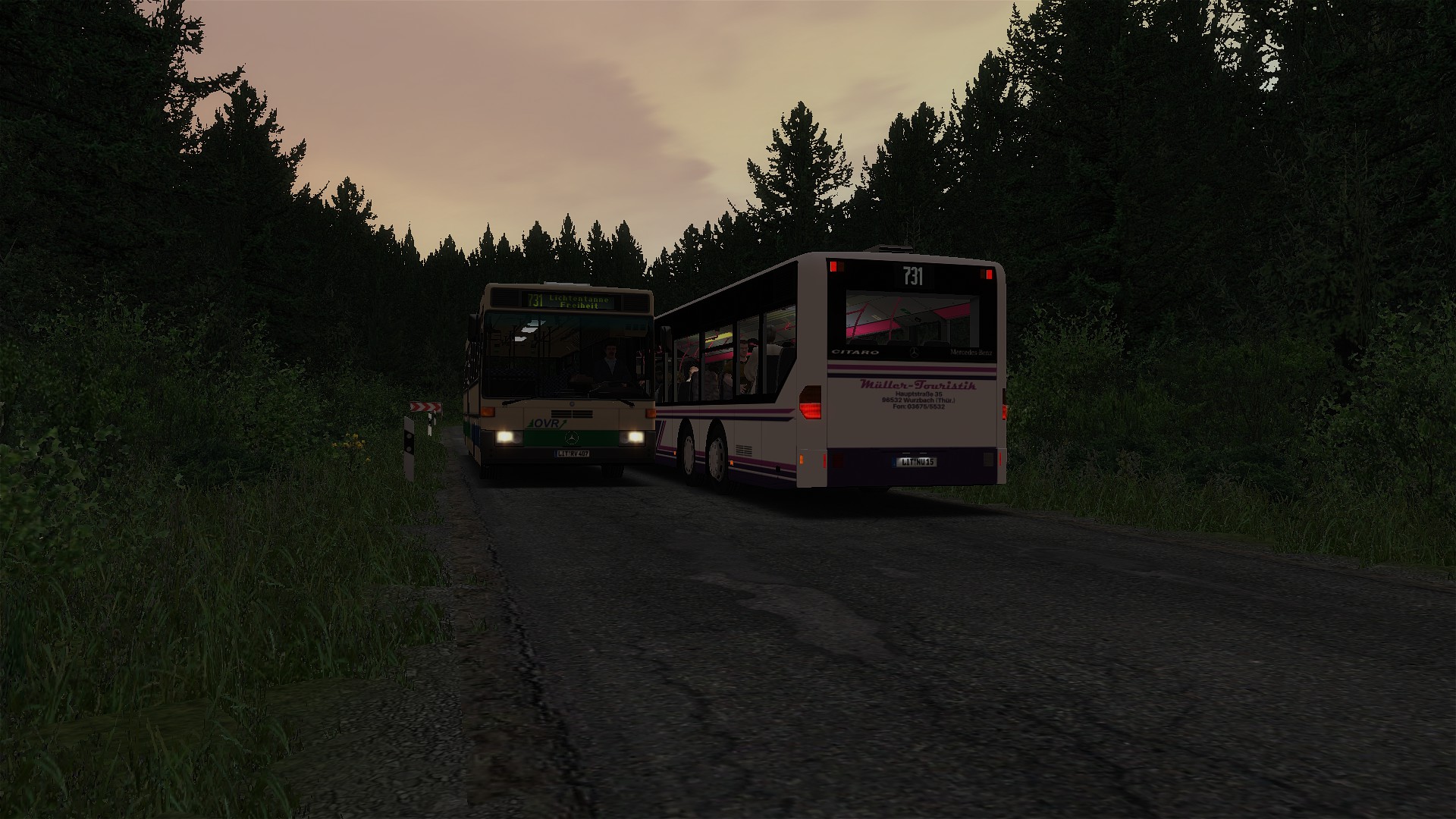 Standesgemäß treffen sich die Umläufe auf dem 731 immer zwischen Steinermühle und der Felsentreppe, damit es auf jeden Fall eng wird. Der Kollege der OVR fährt heute mit einem älteren O407. Was eine spannende Zeit. Einige Fahrzeuge sind schon mit VDV und Niederflur ausgestattet, während andere noch mit VÖV ausgestattet und 20 Jahre auf dem Buckel haben.