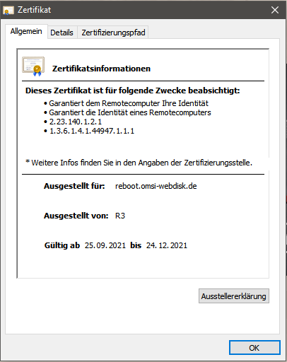 Das Zertifkat ist gültig, siehe Abbildungen rechts. Die gegenwärtige Serverkonfiguration lässt es auch gar nicht zu, dass ein Zertifikat ablaufen kann, weil sie vollautomatisch verlängert werden, und das deutlich vor dem Ablaufdatum, so dass es gar nicht zu Problemen kommen kann.