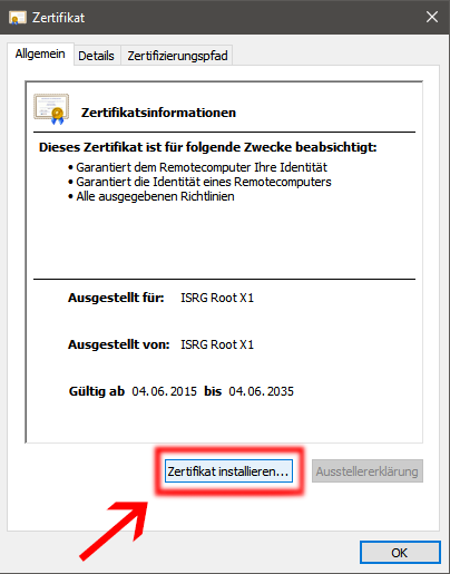- [Optional] Um Problemen mit anderen Websites mit derselben "unsicher"-Meldung aus dem Weg zu gehen, kannst du auch direkt das X2-Zertifikat noch mitnehmen: https://letsencrypt.org/certs/isrg-root-x2.der