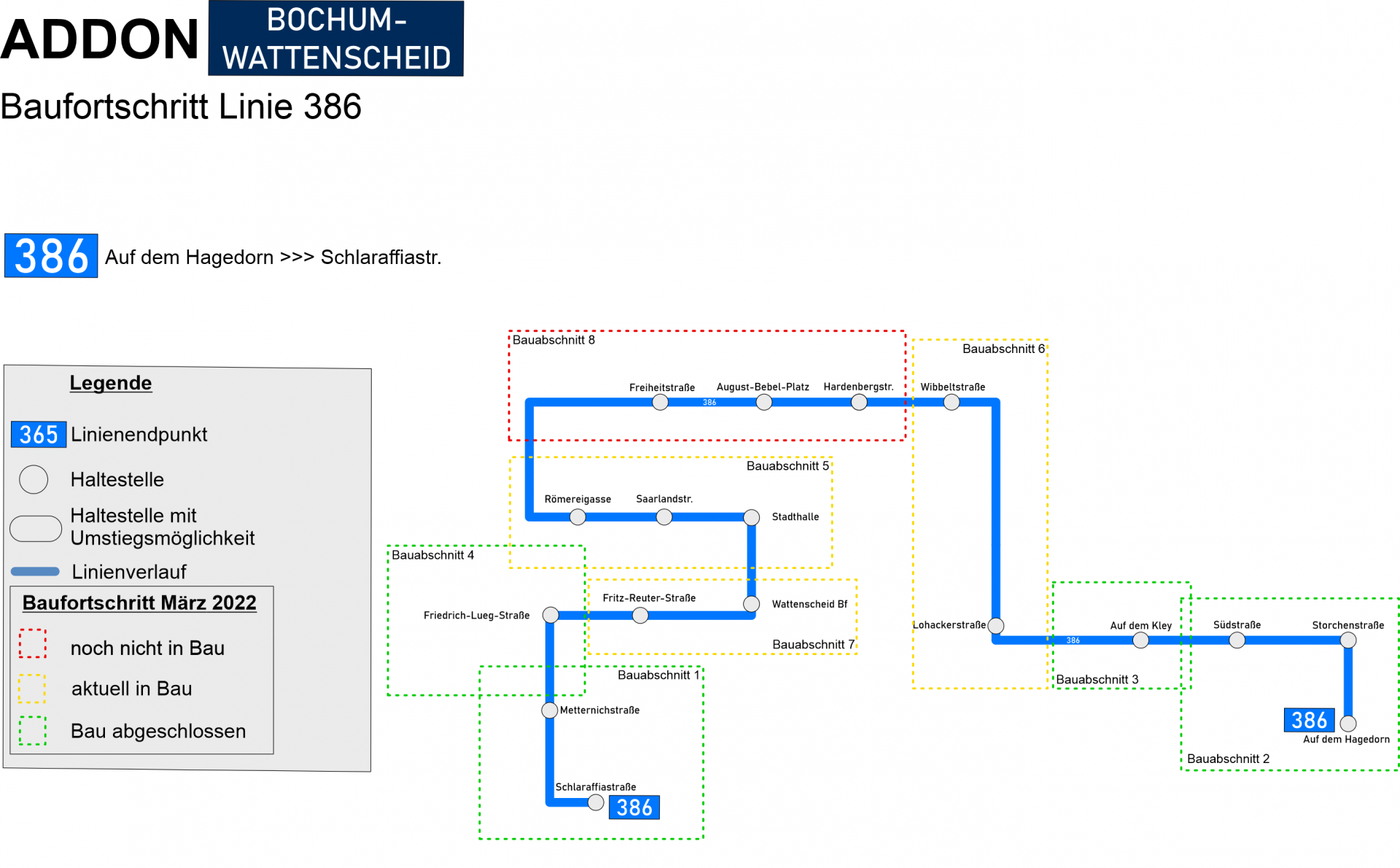 Die Linie 386 wird in Bochum von der Bochum-Gelsenkirchener Straßenbahnen AG betrieben und fährt von der Schlaraffiastraße in Bochum-Westenfeld über den Stadtteil Wattenscheid-Mitte über die Haltestellen (H) Wattenscheid Bf, (H) Freiheitstraße und (H) August Bebel Platz zur Haltestelle Auf dem Hagedorn in Bochum-Westenfeld. Die Fahrtzeit beträgt 24 Minuten, es werden insgesamt 17 Haltestellen angefahren(Bild weiter unten). Die Linie fährt montags bis samstags im 60 Minuten-Takt. In der Woche startet die erste Fahrt in den frühen Morgenstunden an der (H) August-Bebel-Platz in Richtung Schlaraffiastraße. Die letzte Fahrt endet an der (H) August-Bebel-Platz ausgehend von der (H) Auf dem Hagedorn. Aufgrund der niedrigen Nachfrage der Linie verkehrt diese ausschließlich in Solo-Bussen und nicht an Sonn- und Feiertagen.