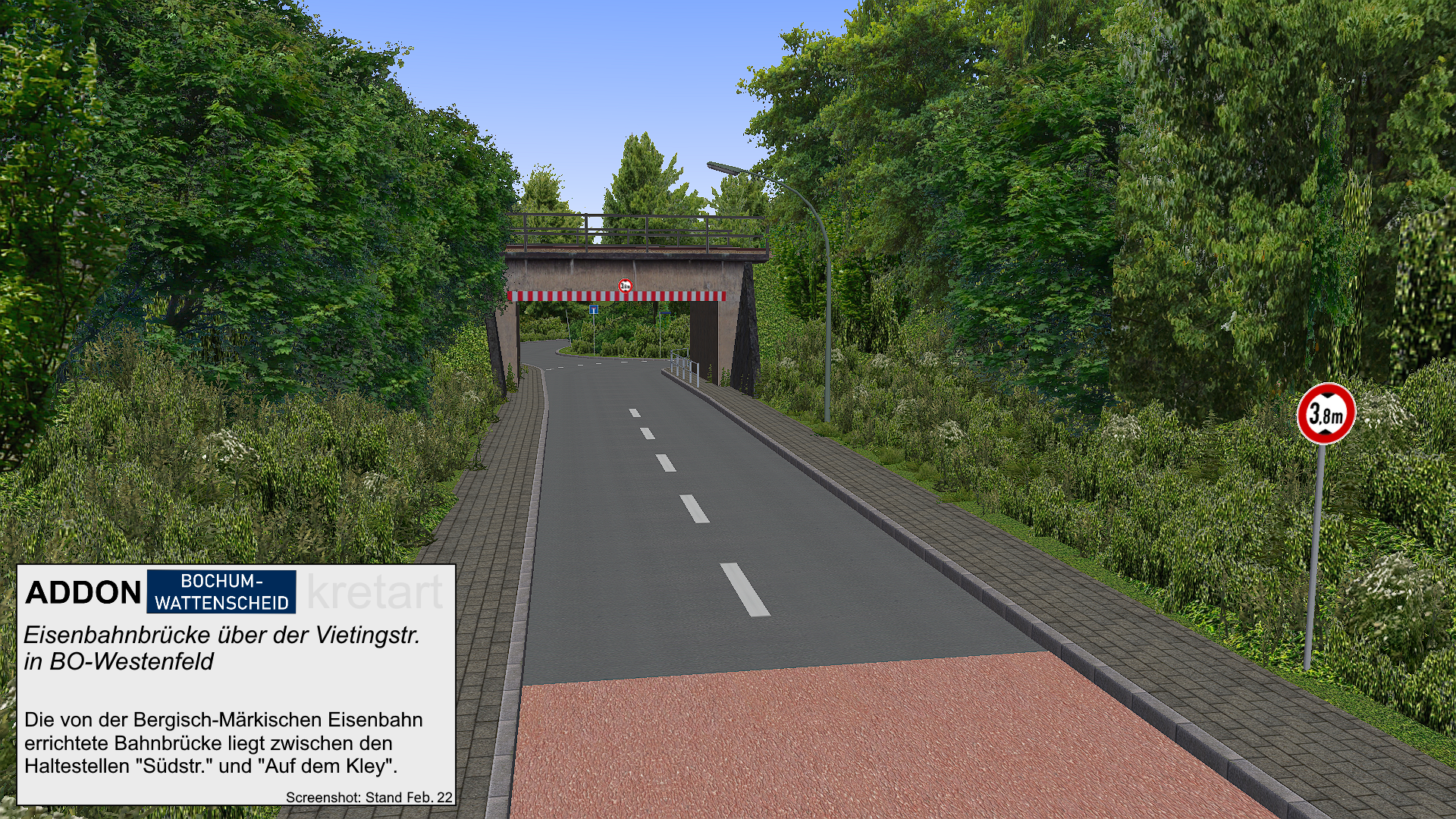 Willkommen in Bochum, der mit 370.000 Einwohnern sechstgrößten Stadt in Nordrhein-Westfalen. Bochum wird in mehrere größere Bezirke eingeteilt, einer davon ist Wattenscheid. Wattenscheid war bis 1975 eine kreisfreie Stadt und wurde daraufhin in die Stadt Bochum eingegliedert. In dieser Erweiterung wird es größtenteils in den realitätsnah umgesetzten Stadtteil Wattenscheid gehen. Der geplante Linienumfang ist erstmal nur die Linie 386 der Bochum-Gelsenkirchener Straßenbahnen AG. Diese Linie wurde unter anderem aus dem Grund als erste Linie gewählt, da diese als einzige Linie das Stadtgebiet von Wattenscheid nicht verlässt. Da es sich um eine reale Karte, sind die meisten Objekte und Splines aus eigener Hand erstellt.