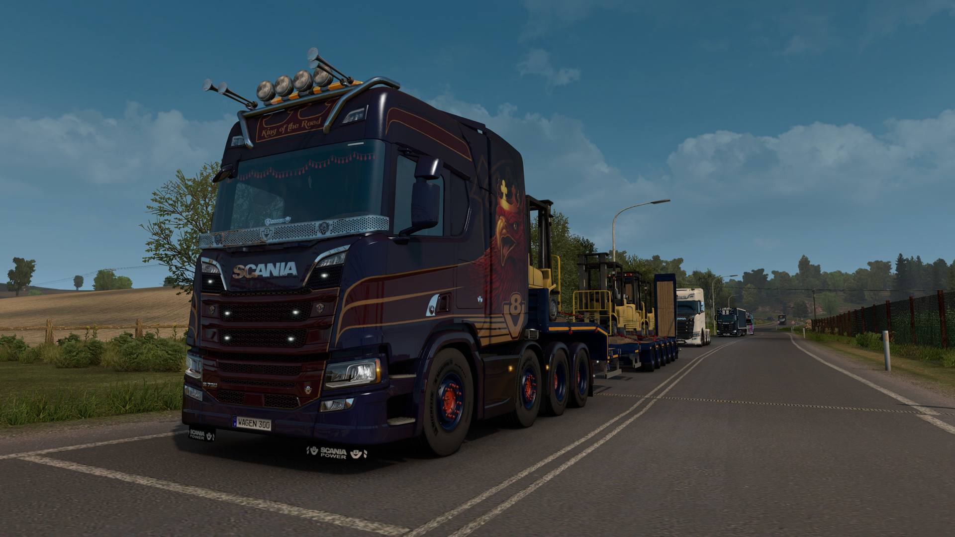 Der SK macht sich auch gut vor den Ekeri Kühlauflieger und dank seiner 530 PS ist er auch nicht unbedingt der schwächste und langsamste Lkw auf der Bahn.