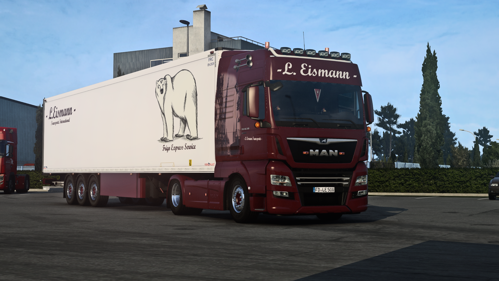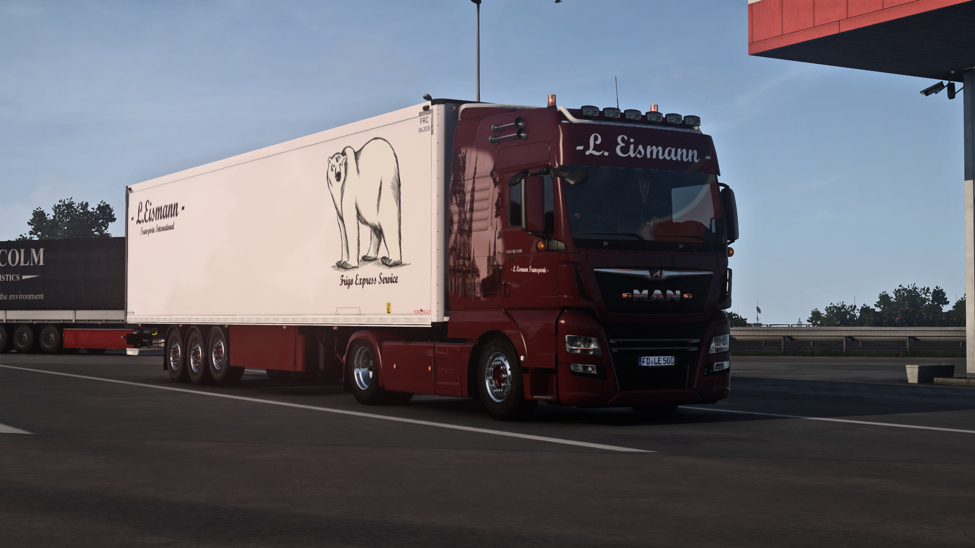 Der SK macht sich auch gut vor den Ekeri Kühlauflieger und dank seiner 530 PS ist er auch nicht unbedingt der schwächste und langsamste Lkw auf der Bahn.