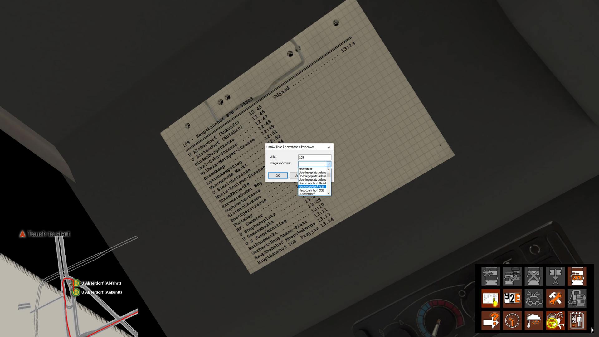 update: I discover so issue it's with Hauptbahnhof. It can't choose Hauptbahnhof ZOB. Same Hauptbahnhof (like in screens) by route:01. When I choose by OMSI options Hauptbahnhof ZOB I can reverse direction and bus stops to U Alsterdorf but passangers can board.