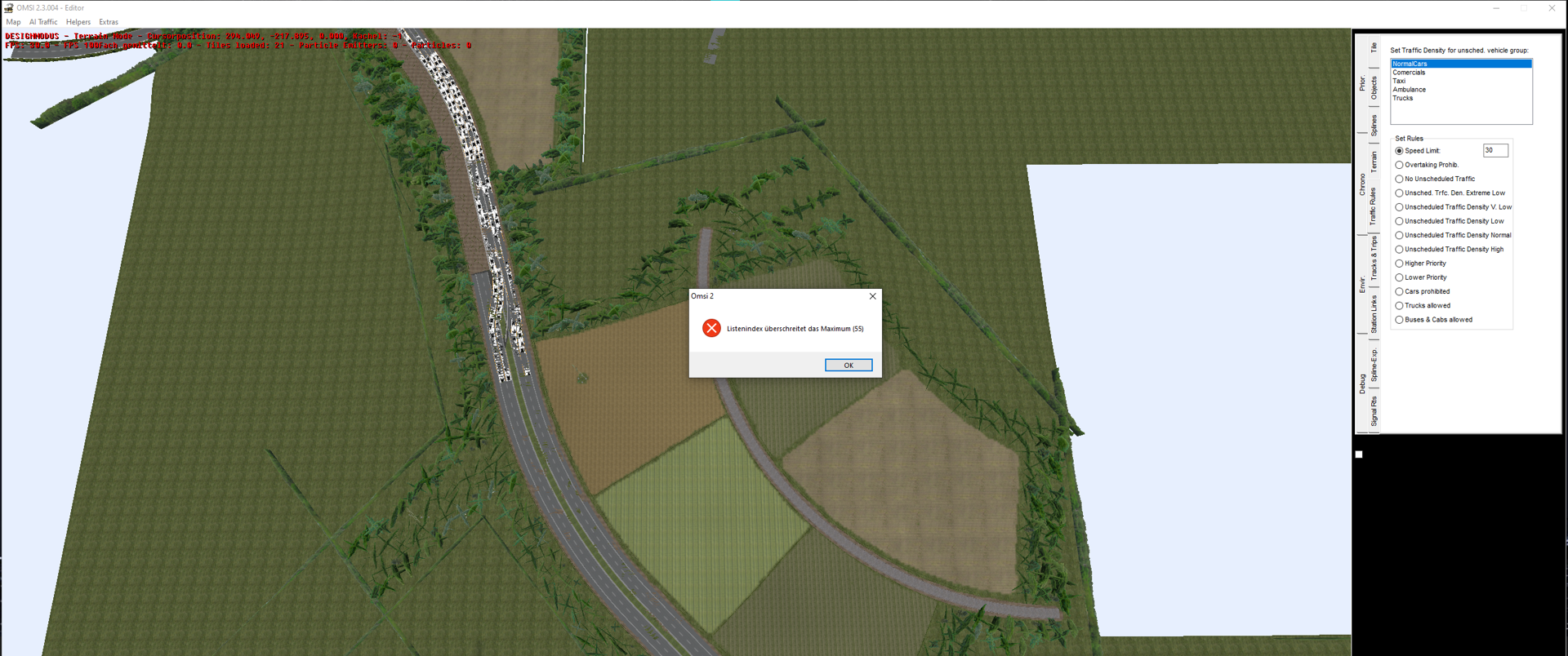 Sobald ich auf dieser Kachel einen Spline anpasse/ neu platziere oder auch einfach nur vom Spline in den Traffic Rules Tab wechsle, bekomme ich diesen Error (Listenindex überschreitet das Maximum (55) - Bild sowie Logfile habe ich einmal unten angehangen). Das erscheint mir etwas komisch, da ich an dieser Kachel seit Fertigstellung gar nichts mehr verändert habe. Ich wollte eigentlich nur die Invis-Streets anpassen und auf einmal kam dieser Fehler ![]()