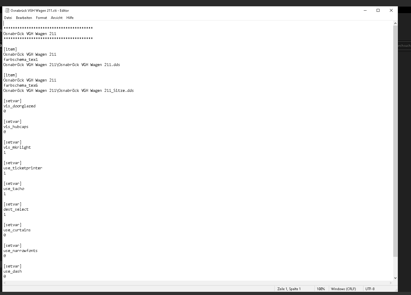 ich die cti Datei erstellt und habe eigentlich alles wichtige reingeschrieben. Ich habe mich beim Speicherformat und cti am ALU Andreesen Repaint orientiert. So ganz zum Schluss habe ich Omsi 2 gestartet habe Grundorf geladen und wollte das Repaint laden aber komischer weiße wird der Bus komplett schwarz angezeigt. Ich weiß leider nicht was ich falsch gemacht habe. Ich würde mich über einen Rat oder Hilfe sehr freuen. Ich werde alle Dateien und Fotos hier reinschicken die dafür relevant sein könnten.