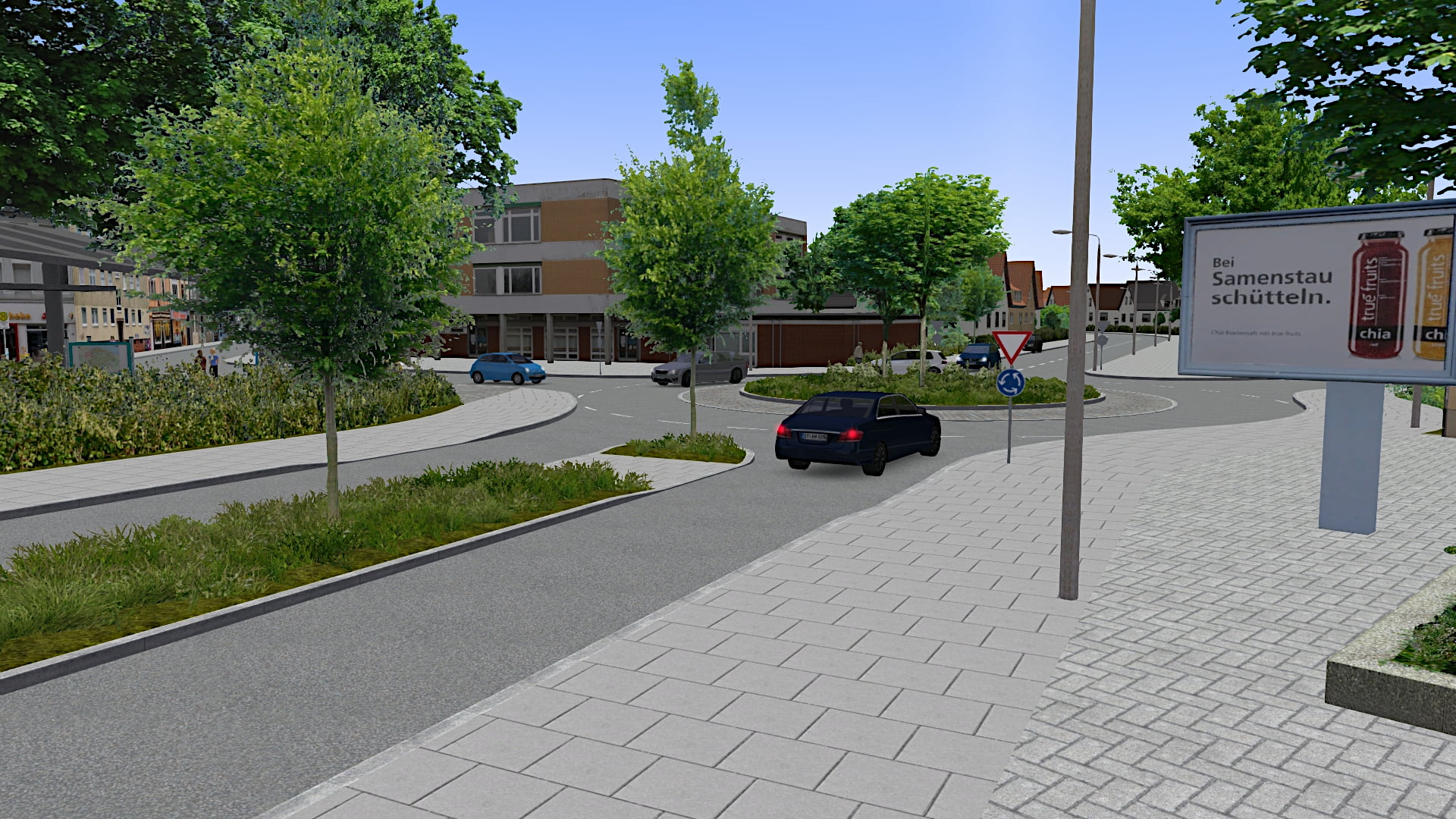 Dann erreichen wir auch schon den umgebauten Marktplatz. Der neue "Mini-ZOB" verfügt über "3,5" Bussteige und ist nun überdacht. Hier kommen auch noch DFIs hin, die liegen aber grade noch in der Werkstatt (aka Blender) rum. ![]()