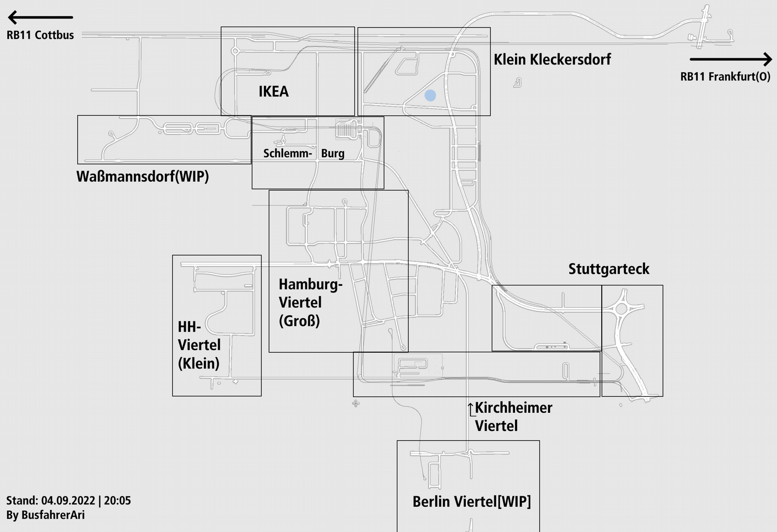 Sichtlich gesehen ist Kleckersdorf In Viele Verschiedene Bezirke Wie in Berlin oder andernorts Aufgeteilt, zum einem Gibt's den gleichnamigen Ort Kleckersdorf. Dann das Hamburger Eck, oder ein Stuttgarteck mit Haltestellennamen die auf Ortschaften oder Bahnhofsnamen angelehnt sind.
