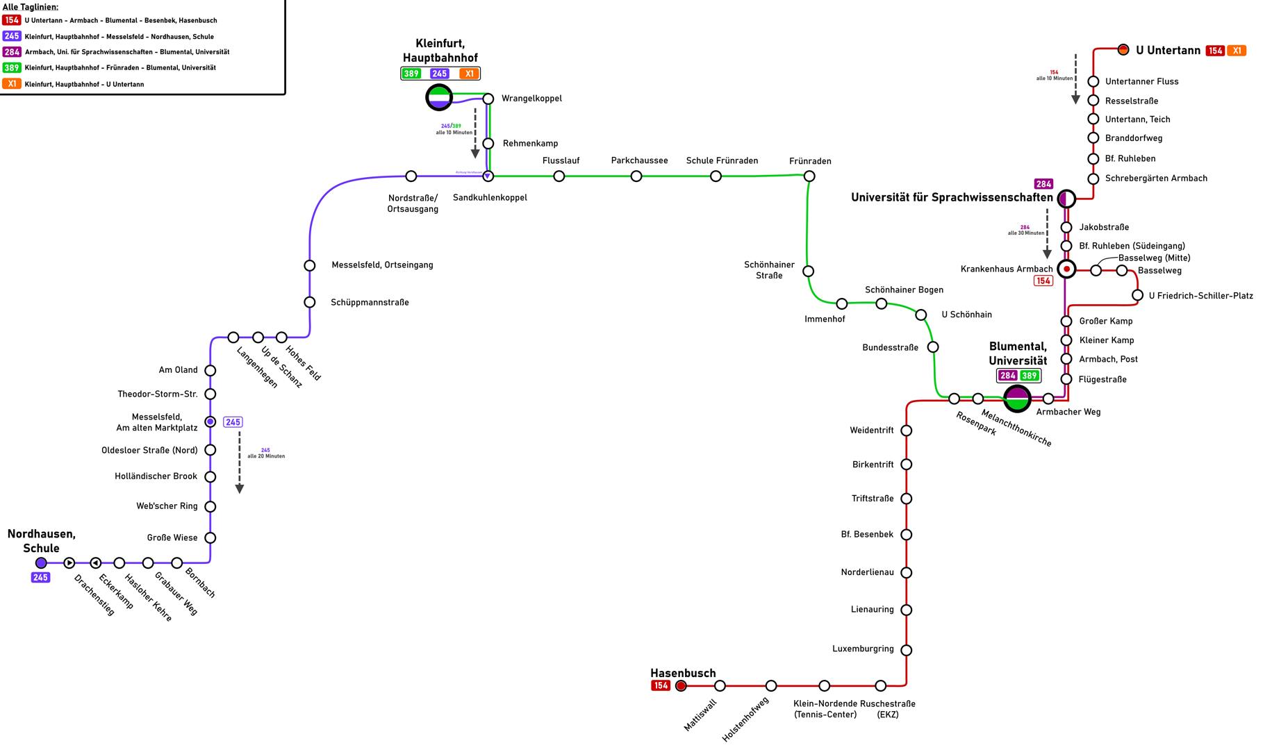 Die Linie 154 stellt die Hauptlinie mit einer Fahrzeit von rund 45 Minuten dar. Sie beginnt am U-Bahnhof Untertann, verläuft weiter über die Armbacher Universität, das Krankenhaus Armbach, wo gegen Abend auch einzelne Kurzläufer enden, dem U-Bahnhof Friedrich-Schiller-Platz, zur Armbacher Post, weiter über die Blumentaler Universität, dem Rosenpark nach Besenbek zur Endhaltestelle Hasenbusch. Auf der Strecke werden neben den normalen "Stadtstraßen" auch Landstraßen passiert, sowie diverse kleine Seitenstraßen. Es wird ein Gelenkbus empfohlen.