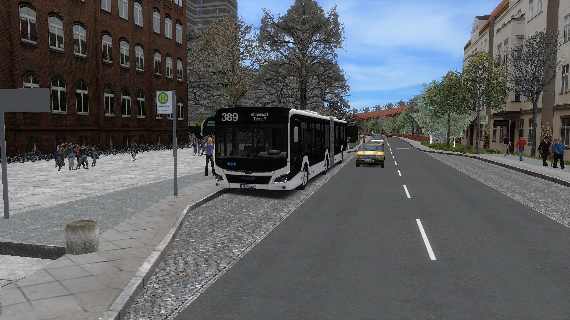 Die Linie 389 ist mit den Linien X1 und 245 die einzige Linie, die den Hauptbahnhof bedient. Sie startet ebenfalls an der Universität Blumental, fährt ab dort ein kleines Stück identisch mit der 154, jedoch zweigt sie nach kurzer Zeit auf eine vierspurige Straße ab, um u.a. den U-Bahnhof Schönhain anzufahren. Von dort aus beginnt ein ziemlich langes Stück Landstraße, welche es einem ermöglicht, den Ort Frünraden zu erreichen. Vorbei an der Schule Frünraden und dem großen Fluss geht es in ein kleines Wohngebiet, welches einen letztendlich den Hauptbahnhof erreichen lässt. Die Fahrzeit beträgt ca. 25-30 Minuten.