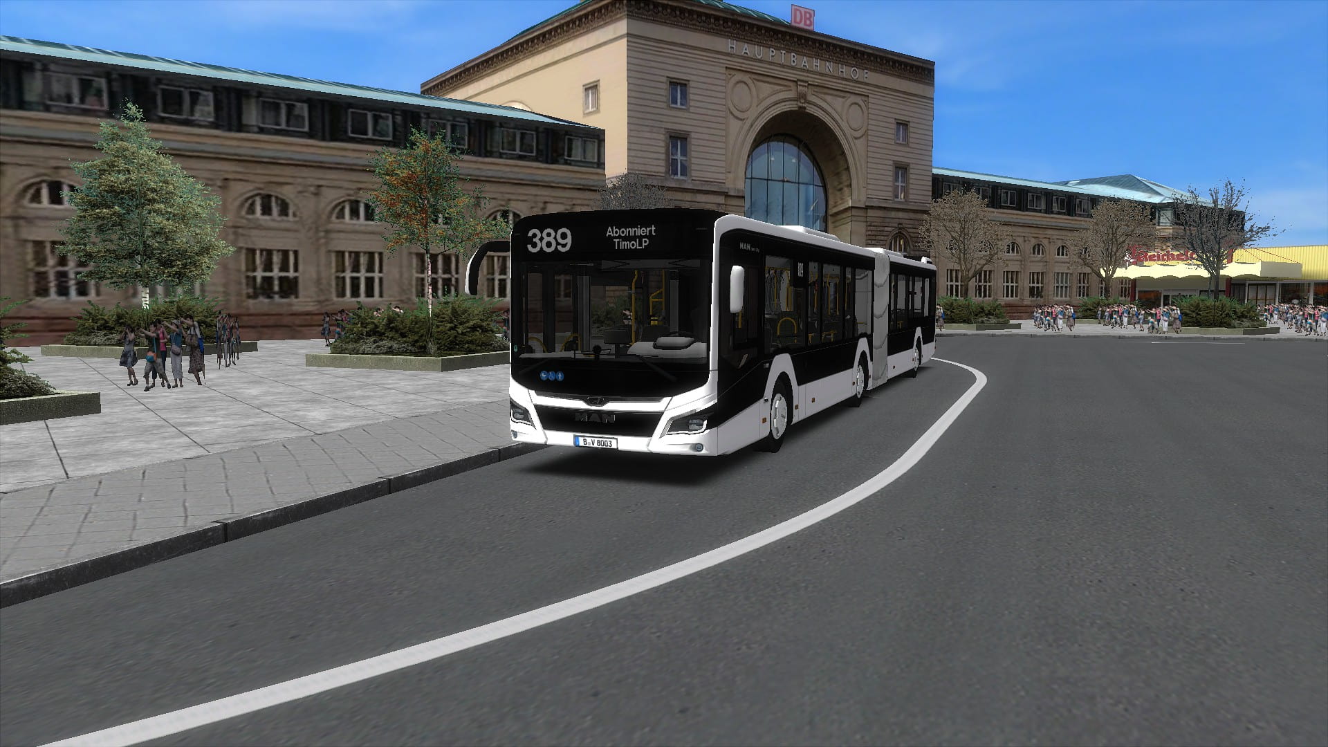 Die Linie 389 ist mit den Linien X1 und 245 die einzige Linie, die den Hauptbahnhof bedient. Sie startet ebenfalls an der Universität Blumental, fährt ab dort ein kleines Stück identisch mit der 154, jedoch zweigt sie nach kurzer Zeit auf eine vierspurige Straße ab, um u.a. den U-Bahnhof Schönhain anzufahren. Von dort aus beginnt ein ziemlich langes Stück Landstraße, welche es einem ermöglicht, den Ort Frünraden zu erreichen. Vorbei an der Schule Frünraden und dem großen Fluss geht es in ein kleines Wohngebiet, welches einen letztendlich den Hauptbahnhof erreichen lässt. Die Fahrzeit beträgt ca. 25-30 Minuten.