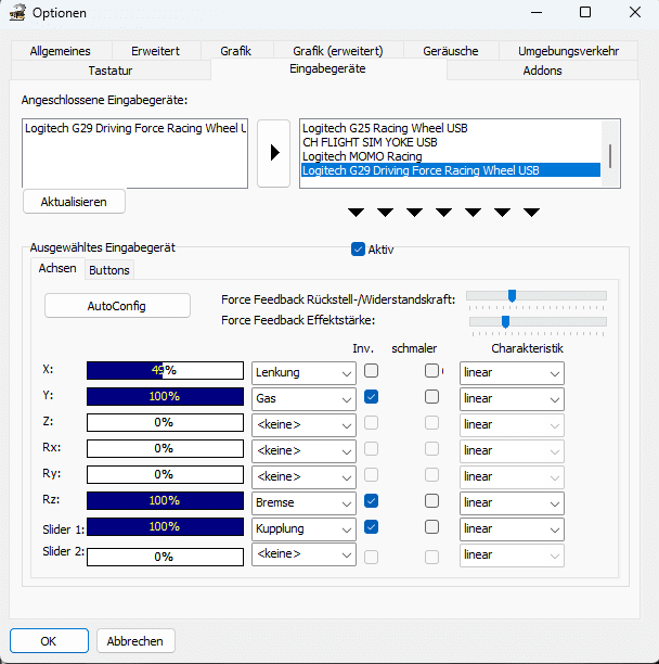 vor kurzem habe ich OMSI 2 auf einen neuen PC installiert und dementsprechend dort auch das im Titel genannte G29 angeschlossen. Dort habe ich das Problem, dass das Force Feedback nicht funktioniert. Es werden ausschließlich die Einstellungen von G Hub (heute installiert) angewendet, womit ich zumindest erreichen konnte, dass die Zentrierfeder nicht mehr so stark ist. Wenn ich jedoch irgendwas hinsichtlich Force Feedback innerhalb von den OMSI Einstellungen verändere, dann tut sich da überhaupt nichts. Über hilfreiche Ratschläge wäre ich der Community sehr verbunden.