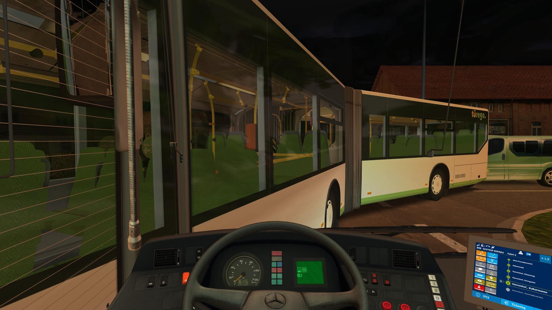 Dann schon bald der erste Unfall, irgendwo beim Abbiegen schoss mir die KI seitlich rein. Generell scheint fürs Abbiegen an vielen Stellen kein Platz zu sein, selbst für einen 12m Bus. Die Haltepunkte an Kreuzungen der KI sind oft sagen wir mal unglücklich. Unglücklich dann auch dass man eine Haltestelle die per Stichfahrt aus beiden Richtungen bedient wird (Treppendorf Markt) auch aus zwei Richtungen in jeweils entgegengesetzter Richtung bedient wird. Sehr schön wenn sich da die Busse begegnen... Es ist eine fiktive Karte wo man die Freiheit gehabt hätte das schöner zu lösen. Und ind er Realität hätte man da auch sicher die Busse nur in einer Richtung geschickt und die gleiche Haltestelle bedienen lassen.