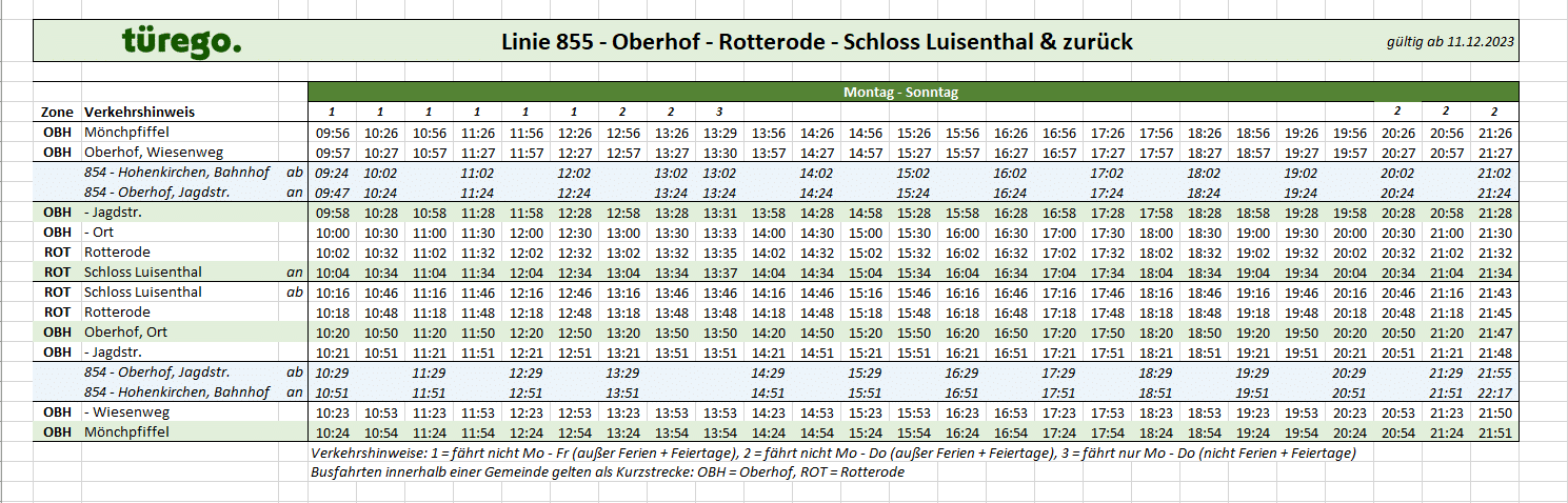 Die 1 verkehrt zwischen Engelshöhe, Bahnhof <> Hohenkirchen, Bahnhof <> Jugendherberge Hohenkirchen, während die 2 zwischen Neustadt <> Hohenkirchen, Bahnhof <> Therme Hohenkirchen verkehrt und damit der 852 den Ast zur Therme abnimmt. Die 852 verkehrt allgemein mit einer geänderten Linienführung, die für mehr Abwechslung ab Angelroda sorgen wird. Dank Kurzläufern und Betriebsfahrten ergeben sich hier interessante Linienwechsel zwischen den Linien.