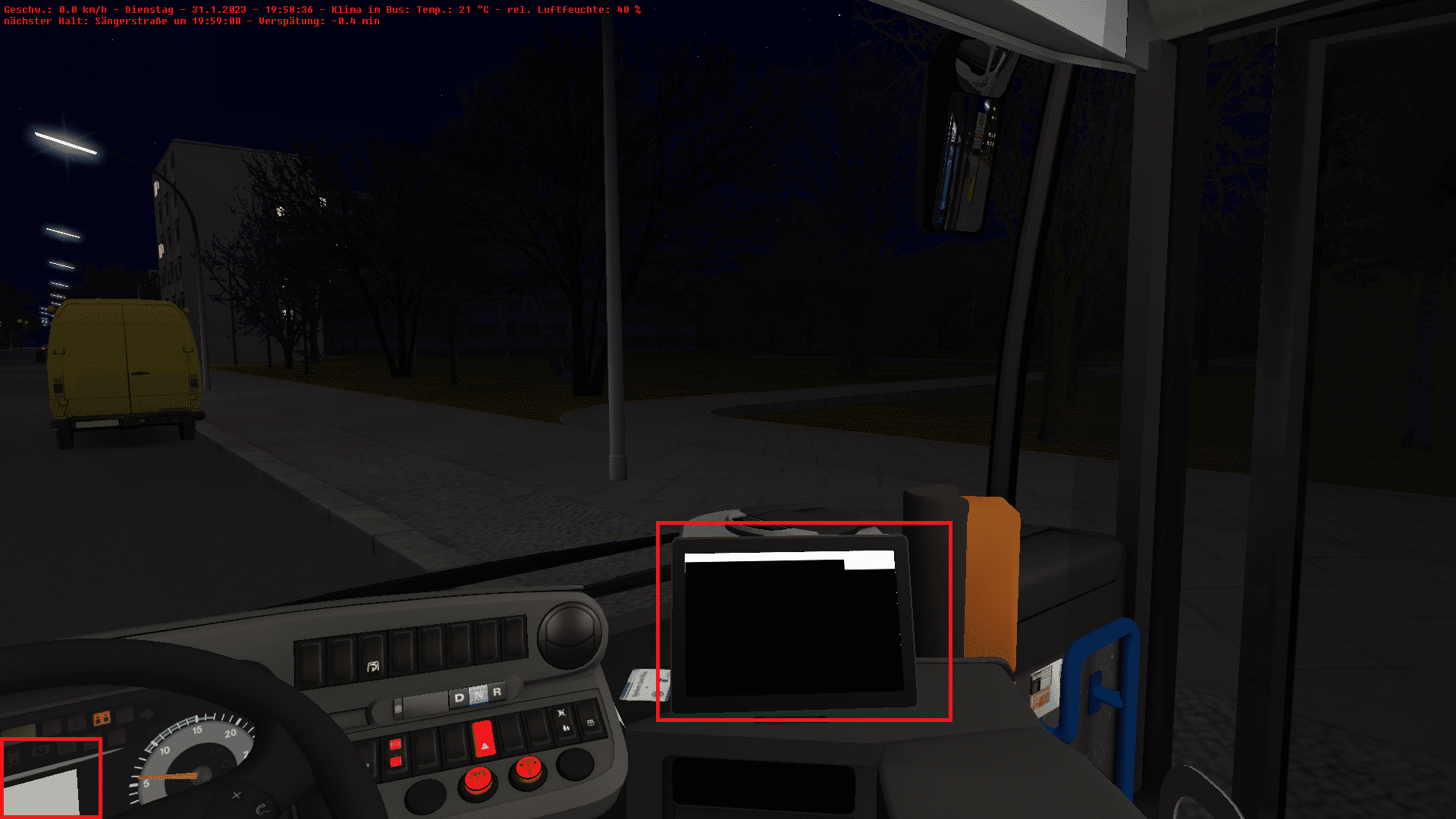 Ich bin auch nochmal in einen anderen Spielstand gegangen (anderer Staddteil & Busversion, älterer Stand) um zu schauen, wie es da läuft. Erstmal alles normal, allerdings fiel nach einigen Haltestellen wieder der Atron & dr Fahrerbildschirm aus (kein gutes Zeichen - siehe Bild) und etwas später kam auch eine Hinweismeldung "Zu wenig Arbeitsspeicher", obwohl ich erst kürzlich auf 16GB RAM umgestiegen bin. Wenn man versuchte, sie wegzuklicken, kam sie wieder. Musste OMSI also wieder über dem TM beenden.