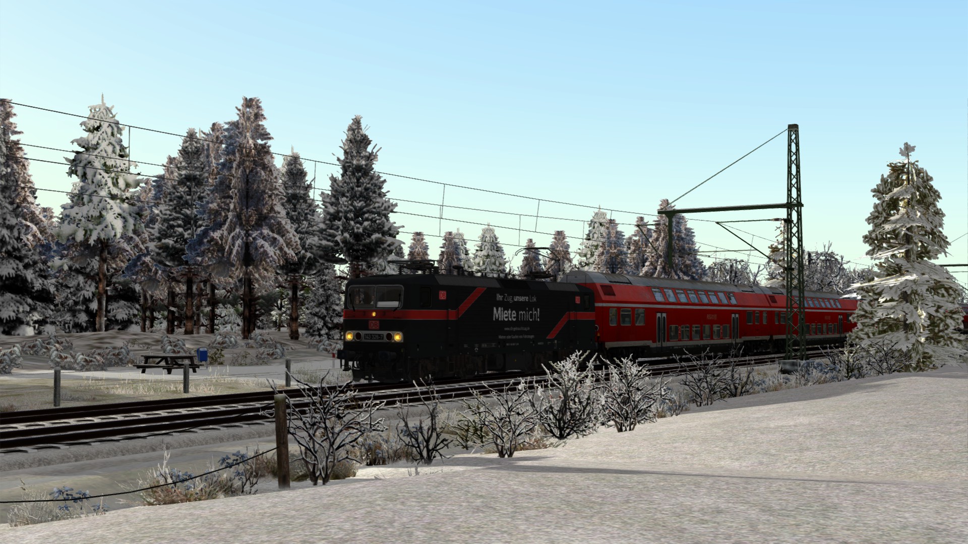 Im Brennitzer Linienstern setzt man nun auf gebrauchte Züge. Hier die Black 143 von DB Miete Mich mit den TTB DR Dosto aus dem Szenario Pack.