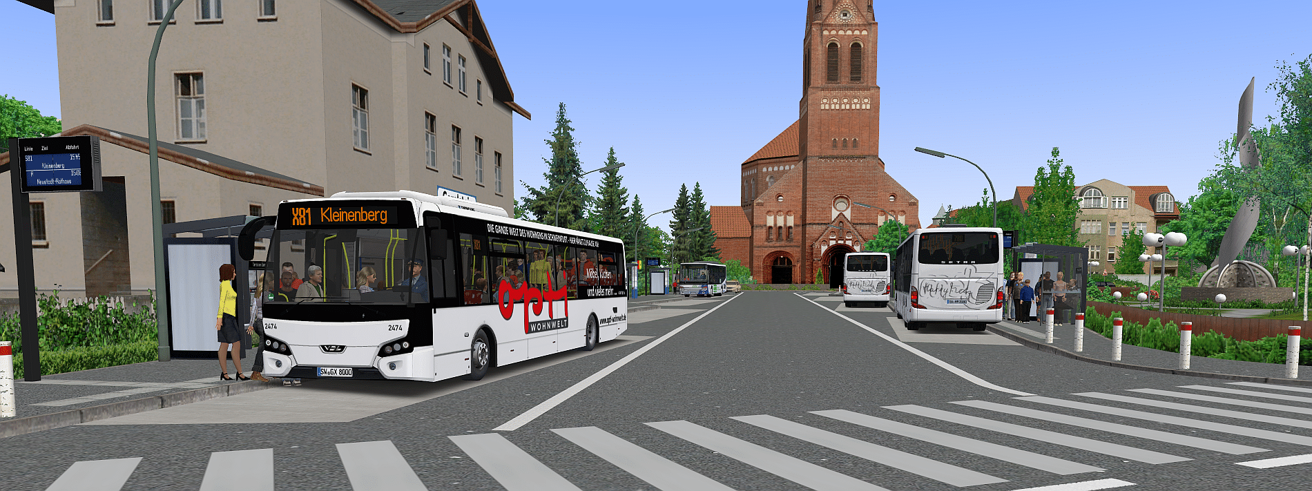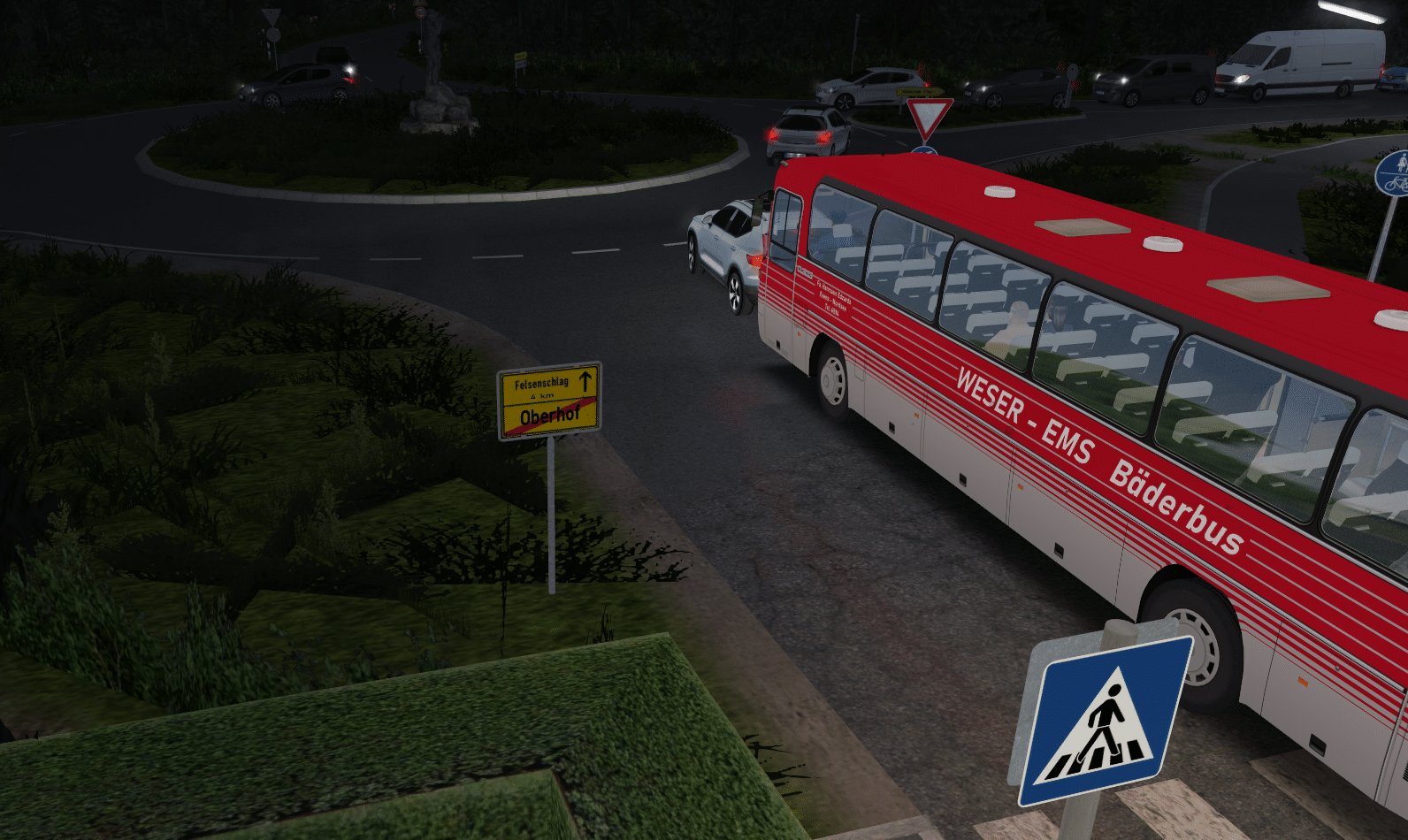 Das Geradeaus Schild muss weg, sonst darf keiner in die Haltebucht fahren (auch der Bus nicht). Oder du entfernst dein Busschild, und setzt unter dein Pfeilschild das Zusatzzeichen "Bus frei". Die Sitzbank rechts, steckt zu tief im Boden. Die Straßenlampe ebenso. Wenn man beides bündig zum Spline anhebt, fällt nicht mehr auf, dass man darunter sehen kann.