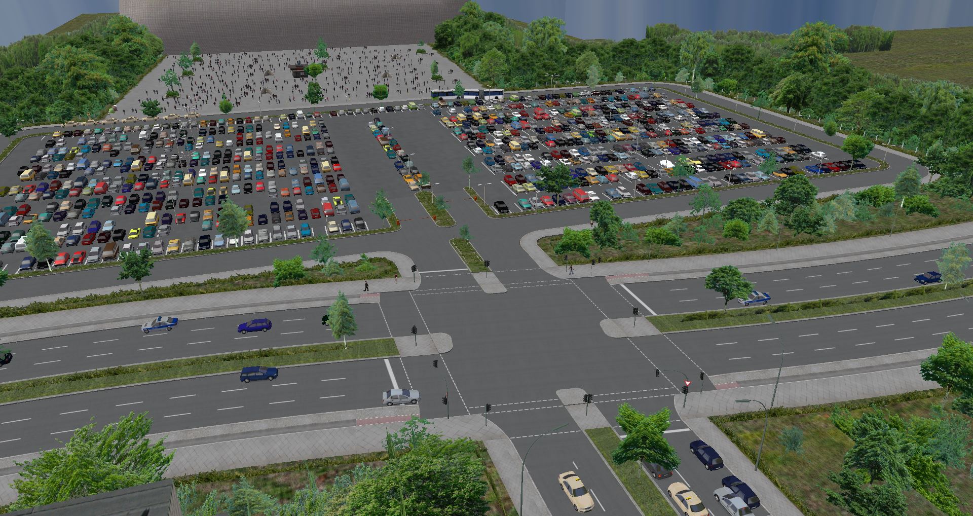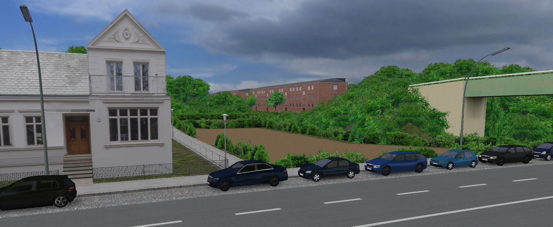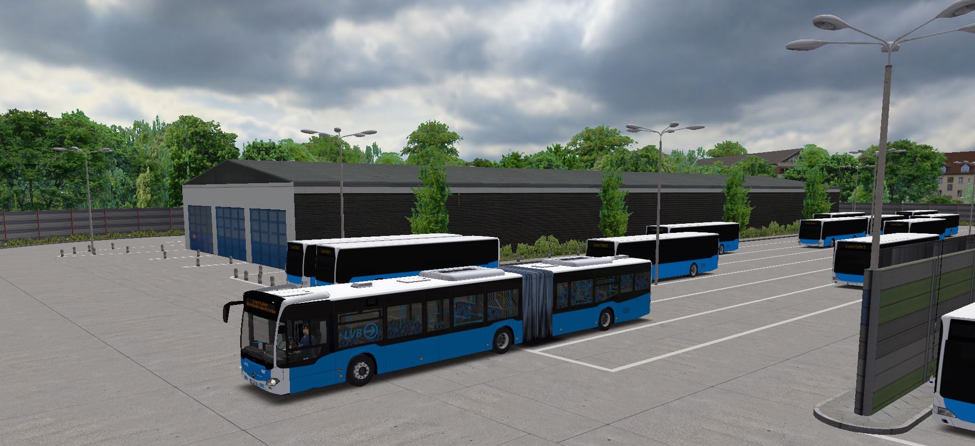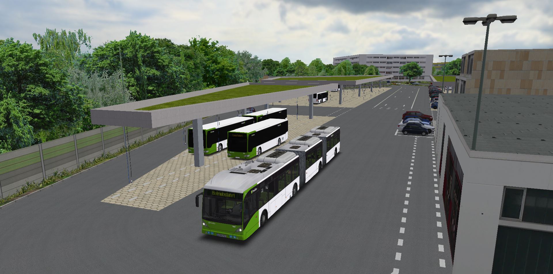 ), so wurde nun ein neues Abstellsystem eingerichtet mit neuen Durchfahrtswegen. Bevor wir auf den Betriebshof kommen sehen wir den neuen Mitarbeiterparkplatz, dieser hat in V2 nur als Verwaltungsparkplätze existiert. Auf dem 1. Bild links werden Doppelgelenkbusse, Capacitys und Gelenkbusse abgestellt, auf dem 2. Bild rechts Gelenk- und Solobusse. Die Busse werden hintereinander abgestellt und mit Luft- und Kabelschläuchen angeschlossen, diese leider nicht in OMSI funktionstüchtig sind, aber immerhin da sind. Wir sehen auf dem 1. Bild noch rechts eine Bushaltestelle, diese wird von Kurzläufern der Linie 666 sowie von Nachtbuslinie N64 bedient, danach auf dem Betriebshof überliegt wird.