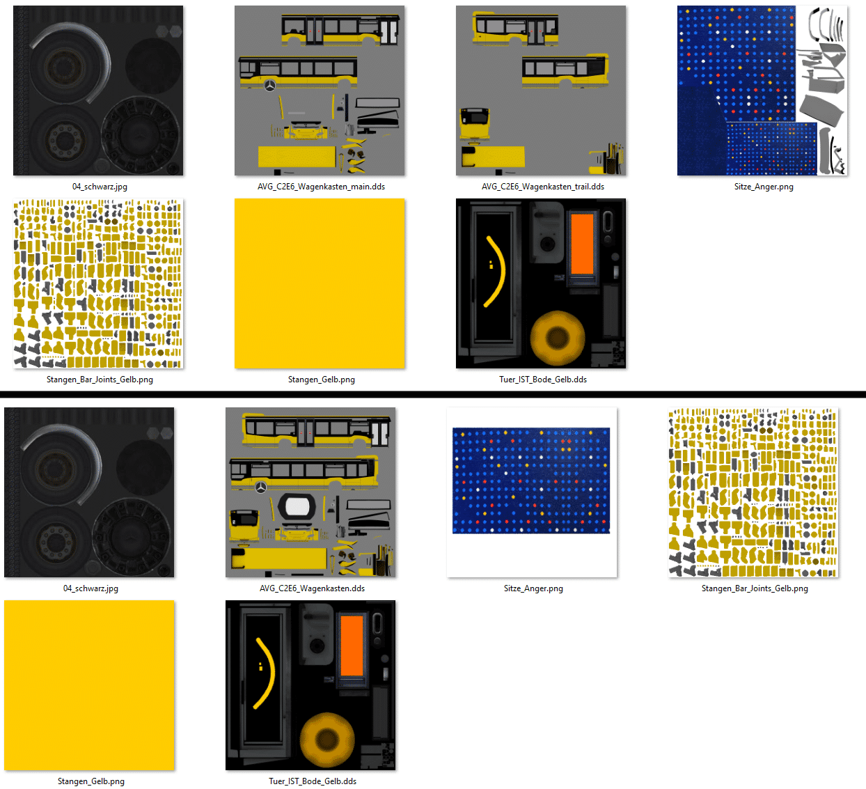 Beim Solo E6 mit dem alten Dash (hier also die Jahre 13-16) sind sowohl beim Spielermodell (MB_C2_E6_Solo_altesDashboard.bus) als auch beim KI-Modell (MB_KI_C2_E6_Solo_altesDashboard.bus) zwar die Türstangen in der richtigen Farbe, aber nicht die Stangen im Innenraum! Die sind wieder blau.