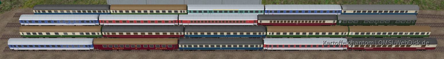 Dieses Paket enthält eine ganze Menge .sco-Dateien, die es erlauben, alle Loks und Wagen, die standardmäßig in Omsi 2 dabei sind, als statische Objekte zu verbauen. Da MR da ganz schön fleißig waren, besonders bei den unzähligen Varianten der Personenwagen, ist auf den Bildern nur eine Auswahl zu sehen. Das sind noch deutlich mehr. ![]()