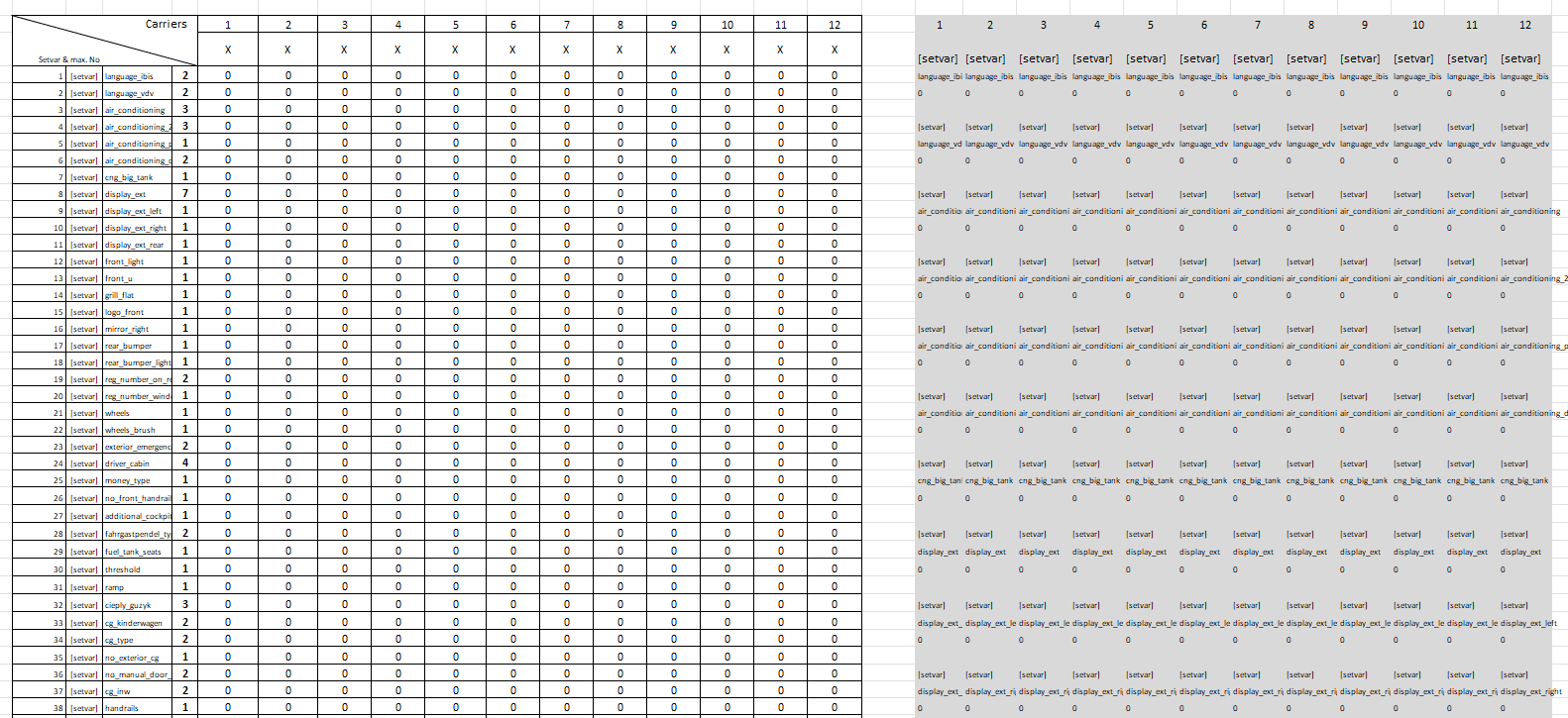 Today I have something interesting for you. I was often bothered by entering setvars manually into Notepad (for large projects, one or two paintings can be entered manually, but not e.g. 30 or so as I did in one of the last packages for Staedtedreieck). I decided to make a simple sheet that makes it easier to work on a larger number of models, and it's even worse when there are a lot of setvars. The Kajot's DLC has 33 vehicles and, note, 73 setvars