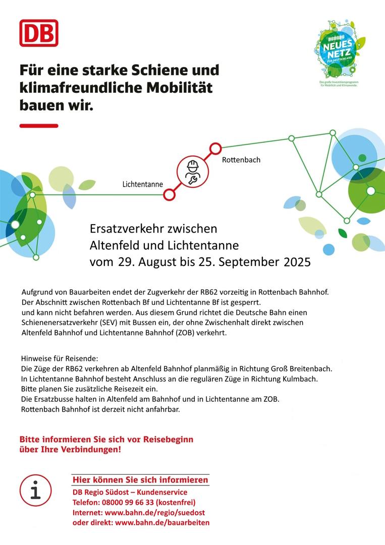 Aufgrund von Bauarbeiten im Abschnitt Lichtentanne – Rottenbach ist die Regionalbahnlinie RB 62 derzeit nur bis Rottenbach befahrbar.