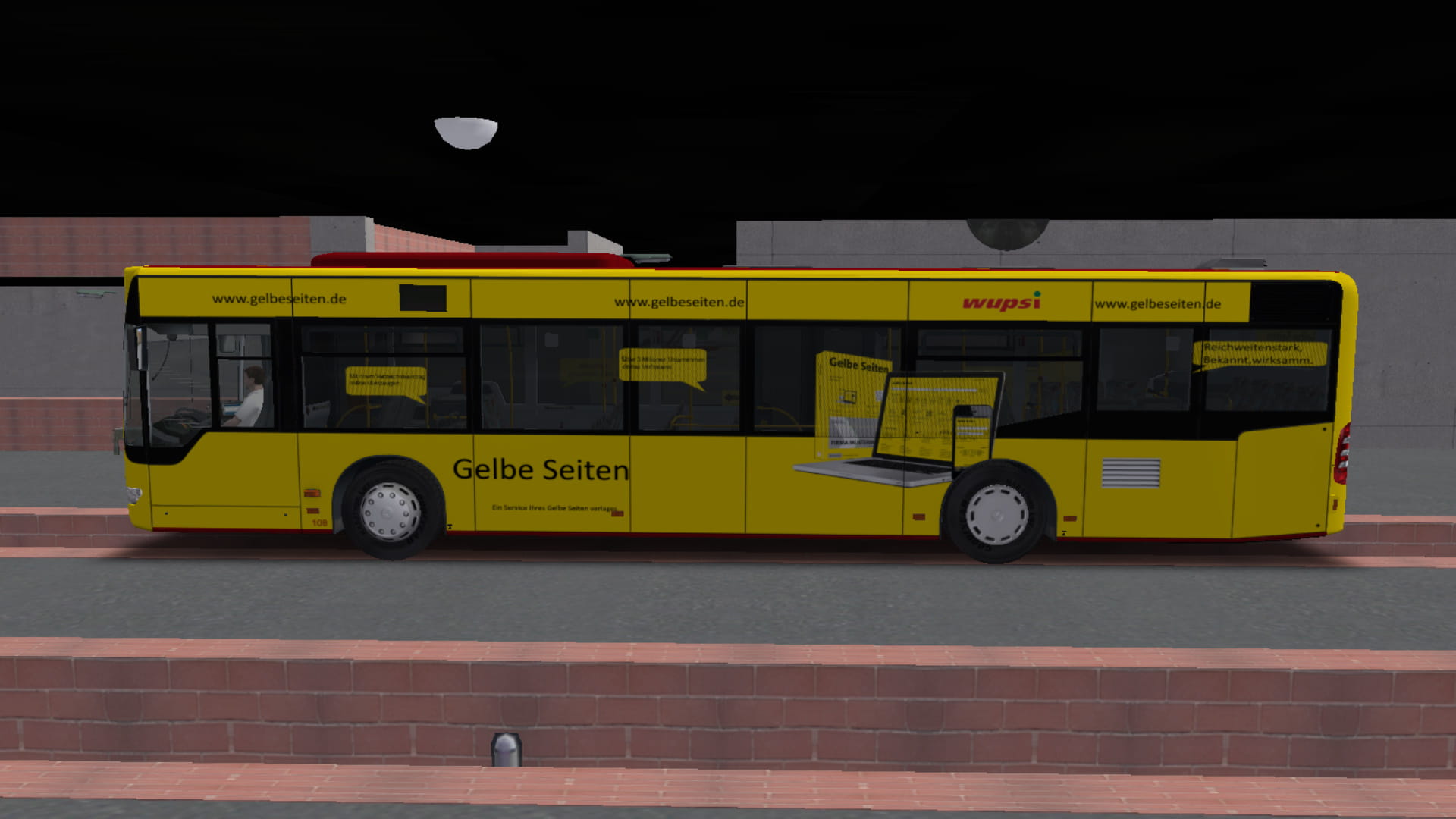Heute gibt es Wagen 108 mit seiner alten Gelbe Seiten Werbung da der Bus einen schweren Unfall hatte wird der wahrscheinlich ausgemustert die Wupsi hat den Wagen seit 2009 der Wagen gehörte erst der zu Kraftverkehr Wupper-Sieg und wurde im Mai 2016 dann an die Wupsi selber übergeben. Auch hier habe ich drauf geachtet das ich die richtigen Sitze in der .cfg eingetragen habe.
