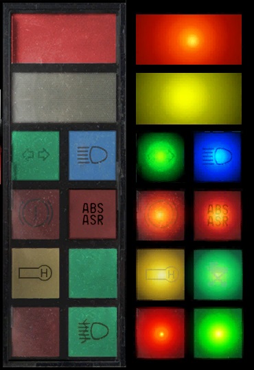 Auf der linken Seite befindet sich die Tagestextur. So werden die Kontrolleuchten am Tage abgebildet, wenn die Kontrolleuchten ausgeschaltet sind. Hiermit kann man 10 verschiedenen Objekten, eine Textur zuweisen. Die selbe Textur gibt es zweimal. Die rechte Seite zeigt die Textur ein zweites Mal. Diese wird als Nachttextur verwendet. Ist die jeweilige Variable zum aktivieren des Texturwechsels aktiv, dann schaltet Omsi um und der rechts, zu sehende Texturausschnitt, wird auf das Objekt aufgelegt. Hierbei ist es egal, ob es in Omsi hell oder dunkel ist, die aufgebrachte Nachttextur leuchtet immer, da diese als direktes Licht konzipiert werden muss. Würde man es als indirektes Licht einstellen, würde man den Effekt nur Nachts sehen.