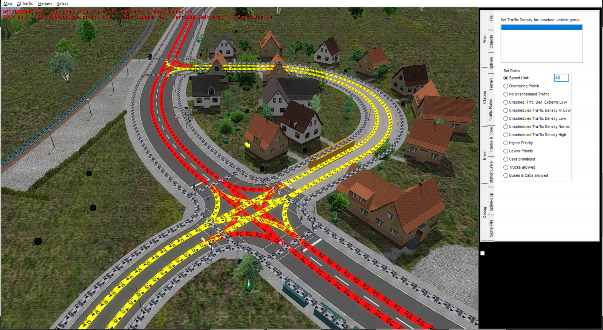 Um eine Verkehrsregel auf einen Straßenabschnitt festzulegen, muss die jeweilige Verkehrsregel ausgewählt werden. Anschließend klickt man die Pfade an, auf denen die Regel aktiv sein soll. Es ist nicht möglich, mit einem Klick mehrere Regeln festzulegen. Zuerst muss jedoch eine Gruppe ausgewählt werden. Es sind die Gruppen, die in der Datei unsched_vehgroups.txt im Kartenordner erstellt wurden.