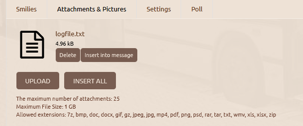Alternatively, the log file can also be attached as an attachment if it is particularly long. This can be done under the post in the tab "File attachments & images". After uploading, the log file will be presented as an attachment as follows: